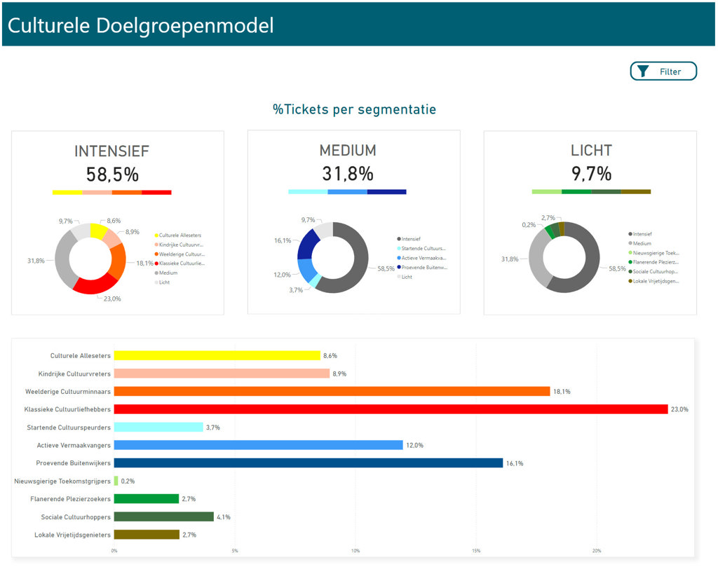 Doorlopend inzicht in je publiek door een live koppeling waarbij klantgegevens direct gematcht worden met een van de Culturele Doelgroepen. Wanneer iemand gegevens (postcode en huisnummer) in jouw systeem achterlaat, worden deze via een webservice gekoppeld aan een Culturele Doelgroep. Werken aan je publieksbereik door continue monitoring en de mogelijkheid om gerichte marketingcampagnes uit te voeren. Het geeft een beeld van hoe de Culturele Doelgroep zich bij jouw organisatie beweegt. Zo heb je onder meer per culturele activiteit (voorstelling, tentoonstelling, e.d.) inzicht in het type publiek dat je aantrekt.
